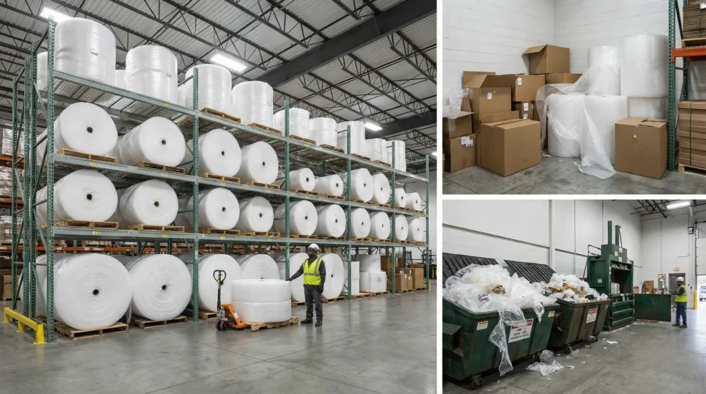 Plastic cushioning generates waste both at the warehouse and at the end customer’s location. Internally, scrap material, damaged rolls, and packaging overruns contribute to plastic waste streams that may require specialized handling.
